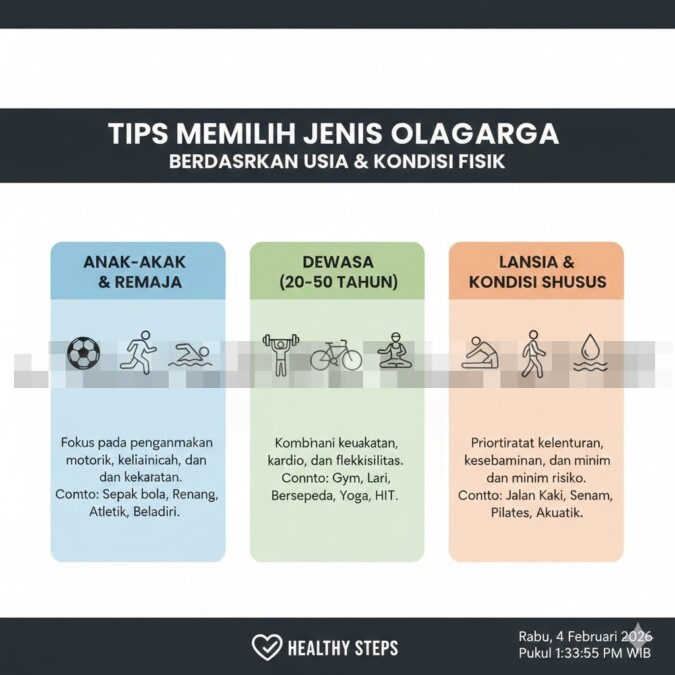 Memilih jenis olahraga yang tepat berdasarkan usia dan kondisi fisik merupakan langkah penting untuk menjaga kesehatan tubuh secara optimal. Dengan penyesuaian yang tepat, olahraga dapat memberikan manfaat maksimal tanpa risiko yang tidak diinginkan. Mulailah dari aktivitas ringan, tingkatkan secara bertahap, dan lakukan secara konsisten agar tubuh tetap bugar dan sehat di setiap tahap kehidupan.